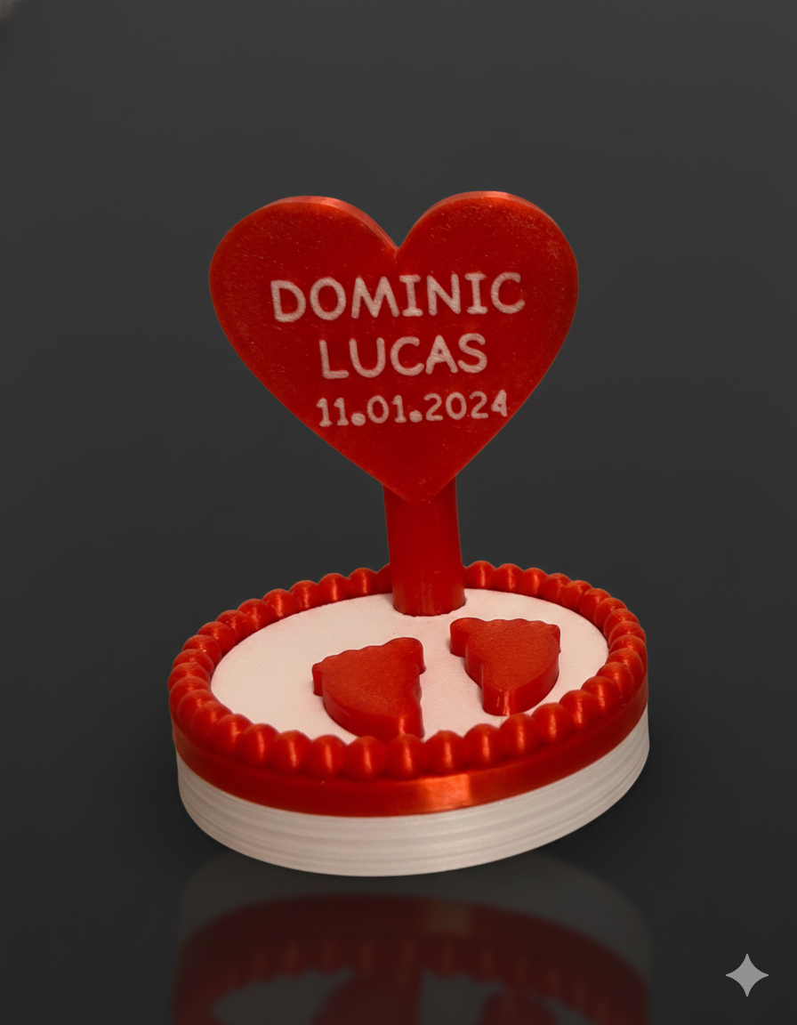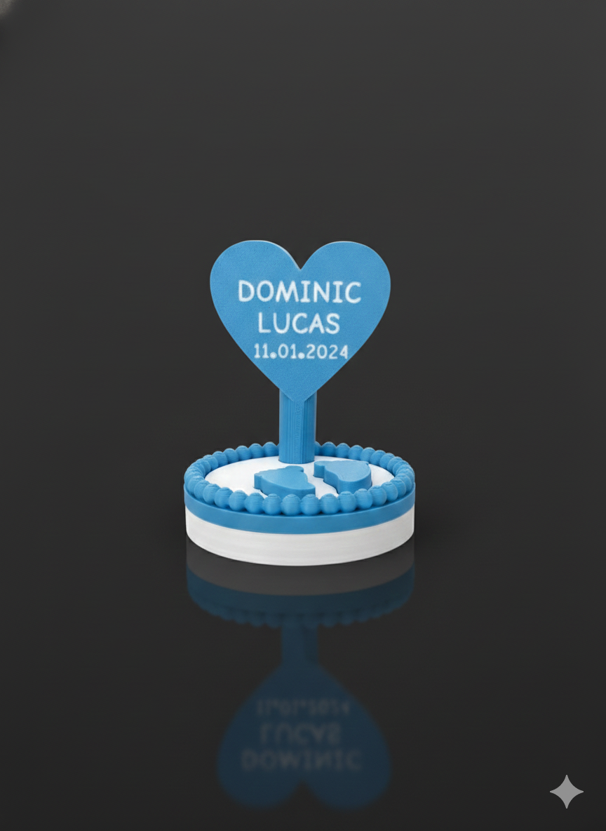 Marturia este realizată prin imprimare 3D este personalizată cu numele bebelușului (ex: DOMINIC LUCAS) și data evenimentului (ex: 11.01.2024), transformând-o într-o piesă unică.